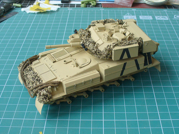 Briti obožavaju kamuflažne mreže, stavljaju je na apsolutno sva vozila. I moj Scorpion je zato dobio zarolanu Barracuda mrežu naprijed i debele kinetic konopce karakteristične za CVR(t) familiju. I kupola je dobila svoju porciju Barracude. Ovako izgleda u crnini: